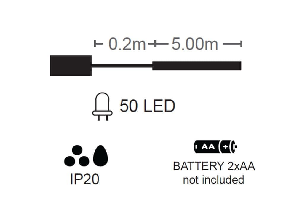 Božični trak napajajo 2×AA baterije (niso priložene).