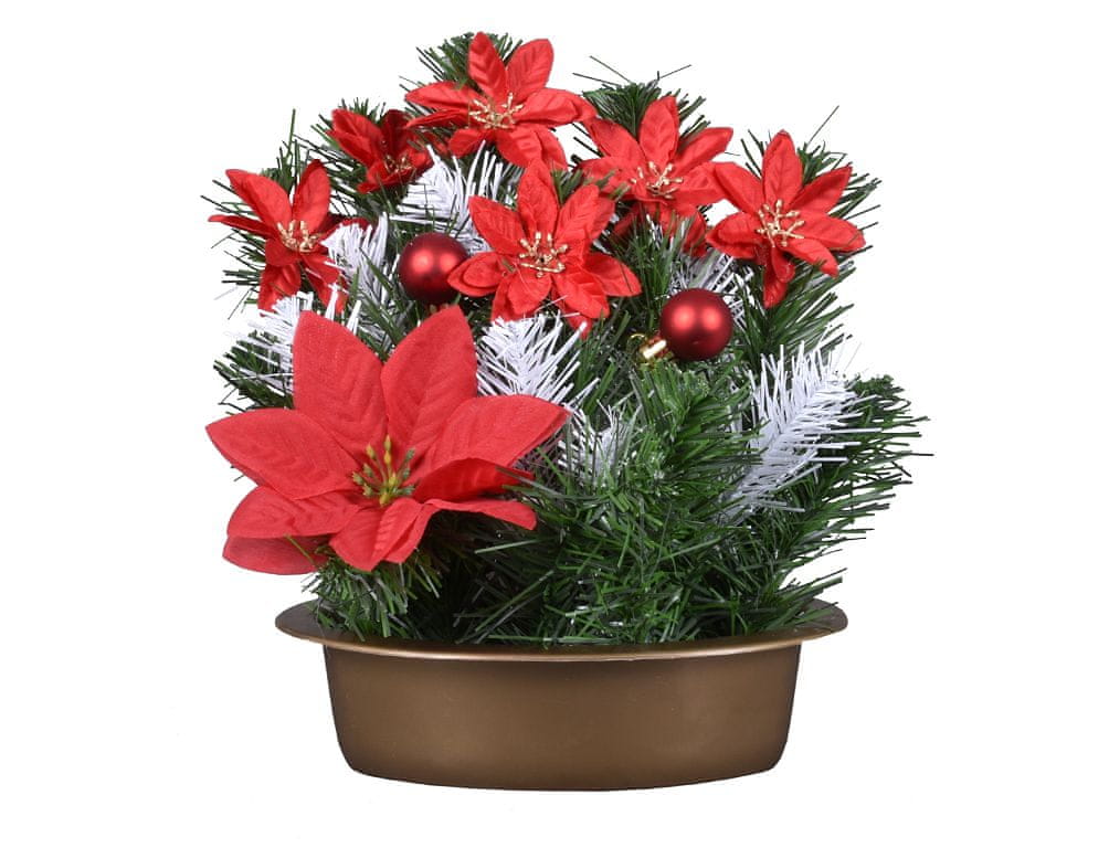 Vezava iz umetnega cvetja. Aranžma umetnega cvetja, ki posnema poinsettije, je postavljen v nizko posodo. Vezava je okrašena z belimi in zelenimi borovimi iglicami ter božičnimi okraski. Primerna sezona: božič. Velikost: 25 cm. Barva: rdeča.