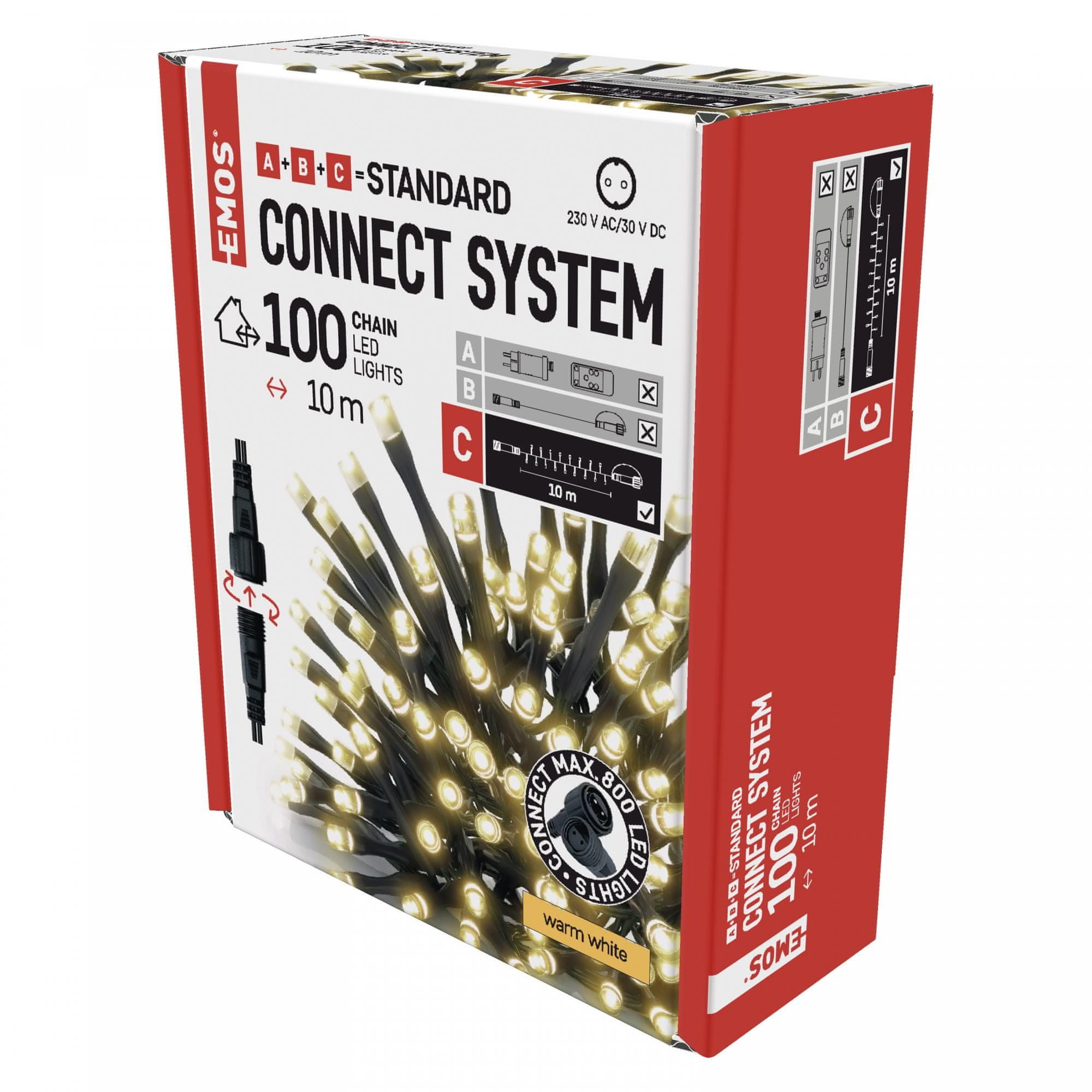 Emos povezovalni niz v obliki svetlobne verige je primeren za zunanjo in notranjo uporabo. Dolg je 10 m, na njem pa je 100 LED lučk, ki vam božično smreko osvetlijo v prijetni topli beli barvi. S to verigo si lahko pričarate si prijetno praznično vzdušje v svojem domu.