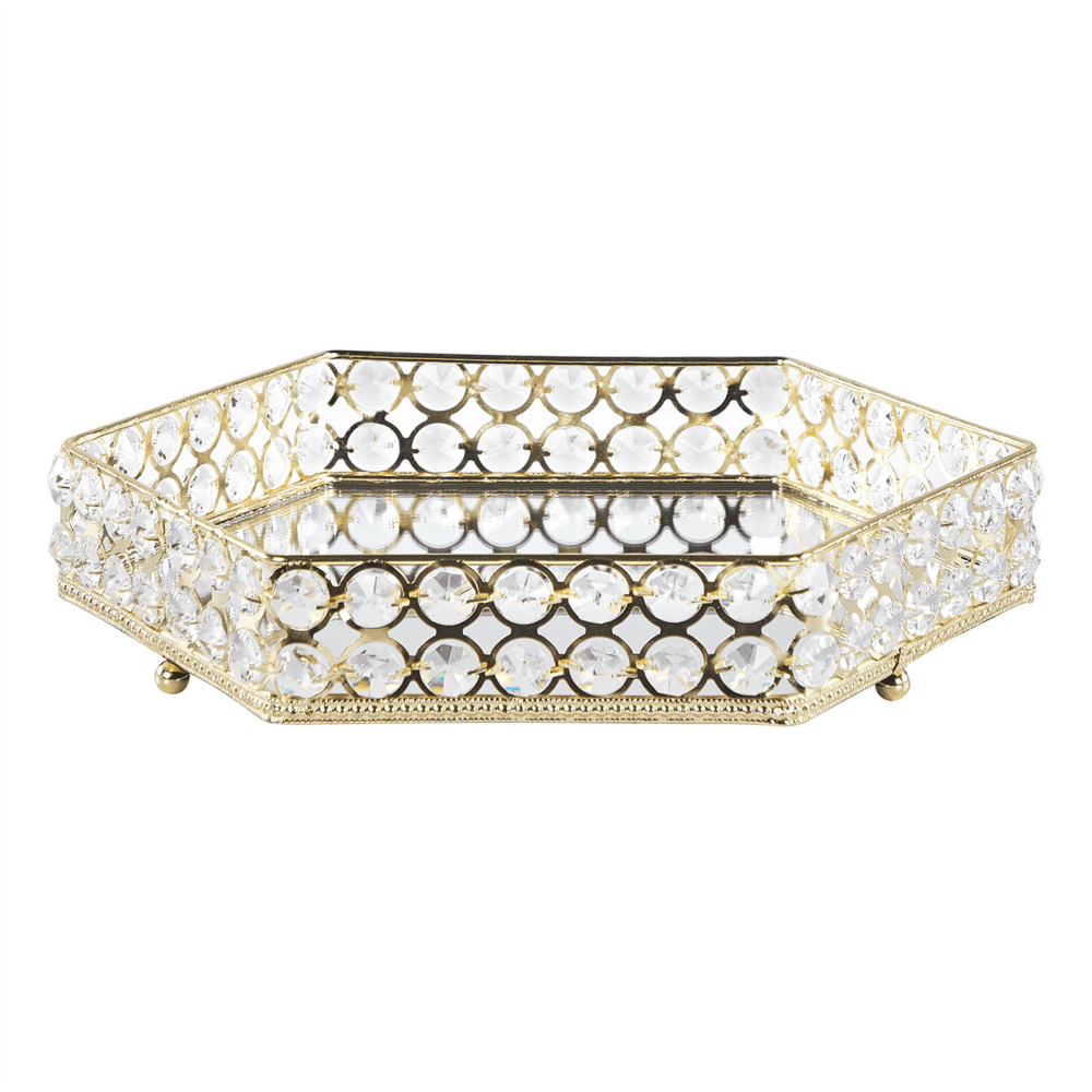 Ta eleganten pladenj je praktičen in dekorativen pripomoček, primeren za vsako elegantno notranjost. Izdelan je iz kovine, ima svetleče steklene kamenčke in zrcalno dno, ki čudovito odseva okolico. Je lahek, zato ga lahko preprosto premikate z enega mesta na drugo. Uporabite ga v spalnici za shranjevanje nakita in drugih malenkosti ali v dnevni sobi kot eleganten oblikovalski dodatek.