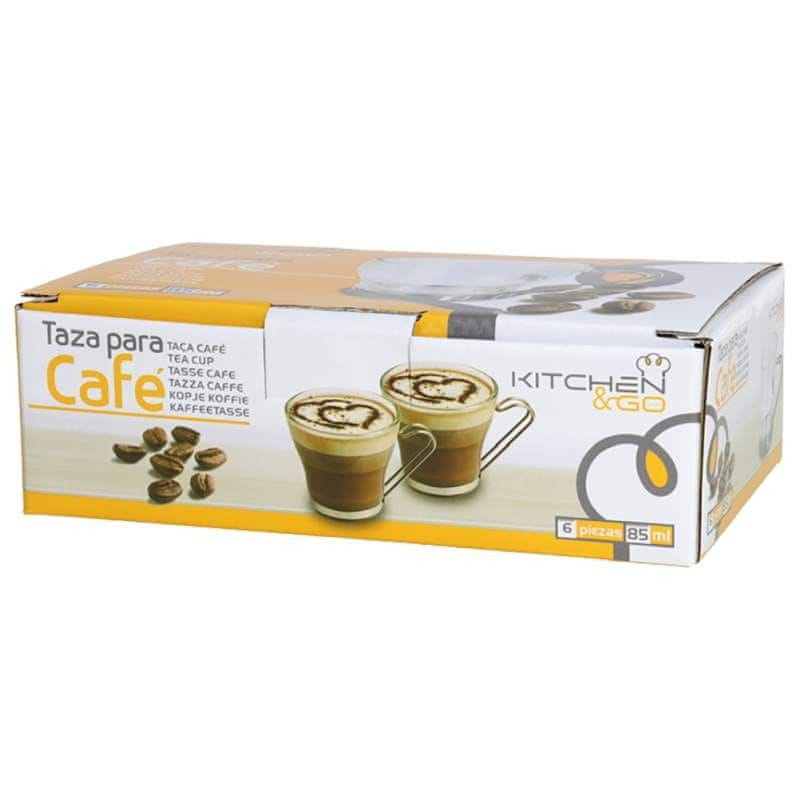 • Set šestdelnih skodelic za kavo s prostornino 85 ml. – Izdelane so iz trpežnega stekla z visokim sijajem. – Ročaji iz nerjavečega jekla z visoko vzdržljivostjo in odpornostjo. -Ni mogoče pomivati v pomivalnem stroju ali mikrovalovni pečici. …