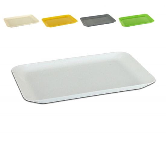 Plastični pladenj za serviranje peciva, sendvičev ali kave, čaja itd. Dimenzije 29,5 × 19 × 2 cm. Barva glede na trenutno razpoložljivost na zalogi (bela, krem, siva, rumena, zelena). Češki proizvajalec. EAN 8590474909609