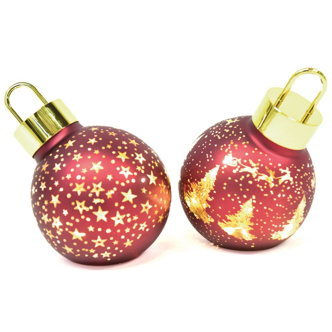 Steklena krogla v elegantni bordo barvi je idealna za praznično božično-novoletno dekoracijo, primerna za mizo, polico ali jaslice. Njena oblika omogoča, da stabilno stoji na ravni podlagi, kar zagotavlja varno in estetsko postavitev. Notranjost krogle je opremljena z LED lučkami, ki skozi zvezdnate in božične vzorce oddajajo prijetno toplo belo svetlobo. Deluje na 2 bateriji tipa AA (nista priloženi), zaradi česar je primerna tudi za prostore brez neposrednega dostopa do električne vtičnice. Pakirana je v lični embalaži.