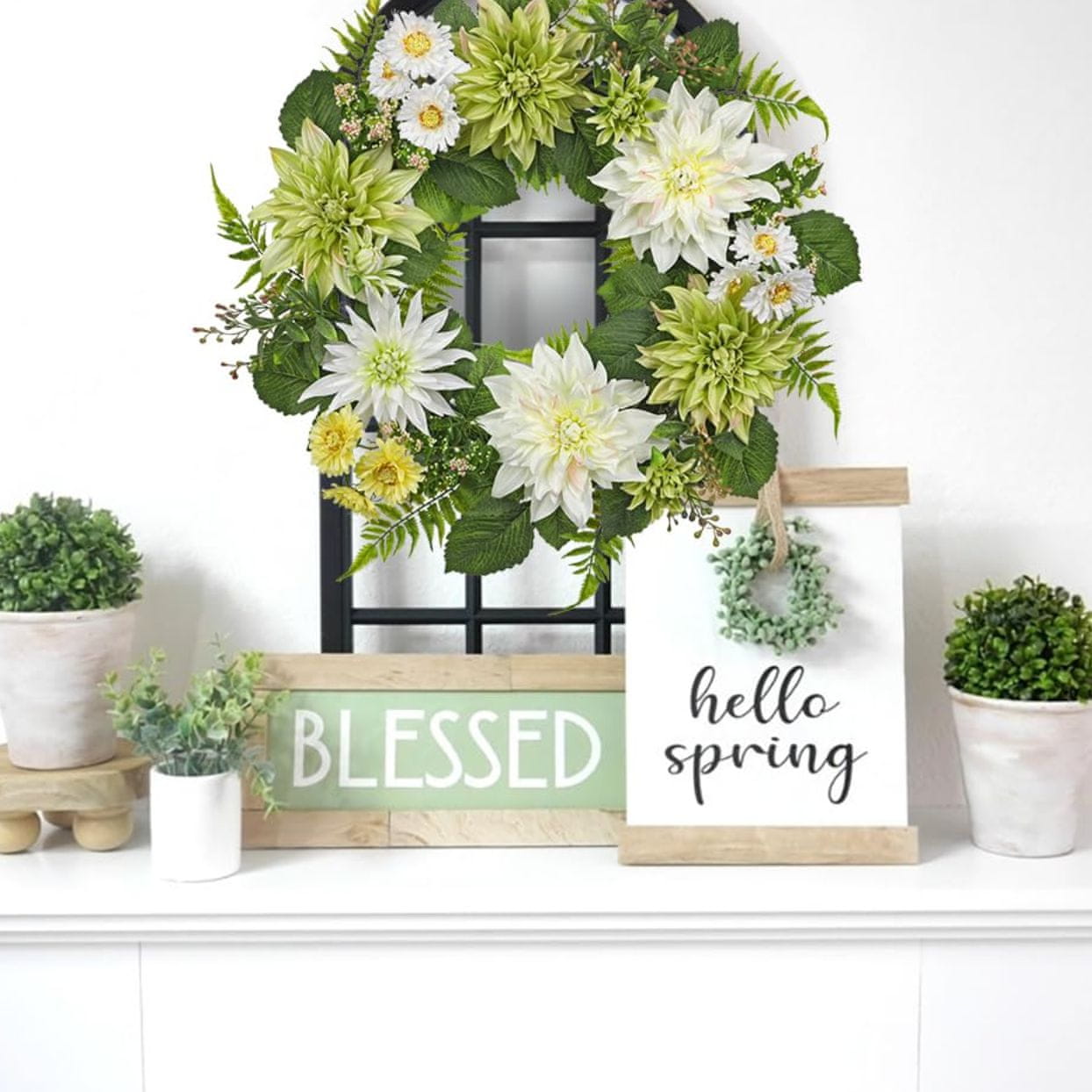 Ta impresiven okrasni venec s premerom 60 cm združuje eleganco in svežino ter predstavlja idealno vizitko za vaš dom. Glavni element kompozicije so natančno izdelani umetni cvetovi bele dalije, ki zaradi visokokakovostnih materialov delujejo izjemno realistično in spominjajo na naravne rastline. Cvetovi so prepleteni z gostim zelenim rastlinjem, kar ustvarja bujno in večdimenzionalno strukturo, ki ohranja svoj brezhiben videz skozi vse leto. Celotna dekoracija je nameščena na trdnem naravnem obroču iz trte, kar izdelku doda pridih rustikalnega sloga in zagotavlja stabilnost pri uporabi.
