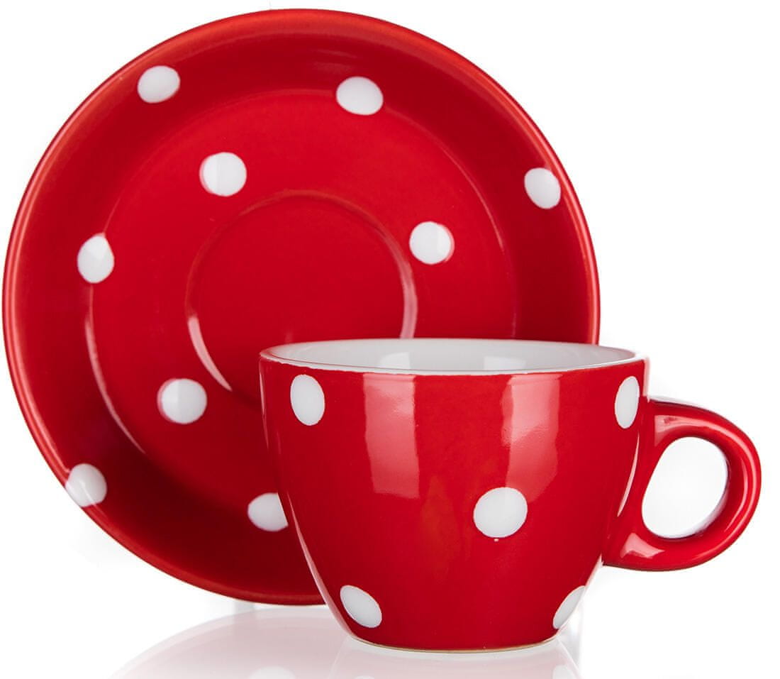 Keramična skodelica in krožnik DOTS, rdeče barve z belimi pikami, je izdelana iz visokokakovostne keramike. Lahko ga uporabljate v mikrovalovni pečici in pomivalnem stroju za običajno uporabo v gospodinjstvu.