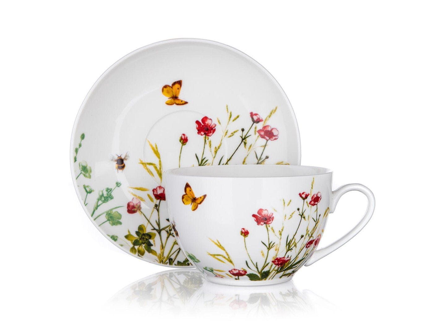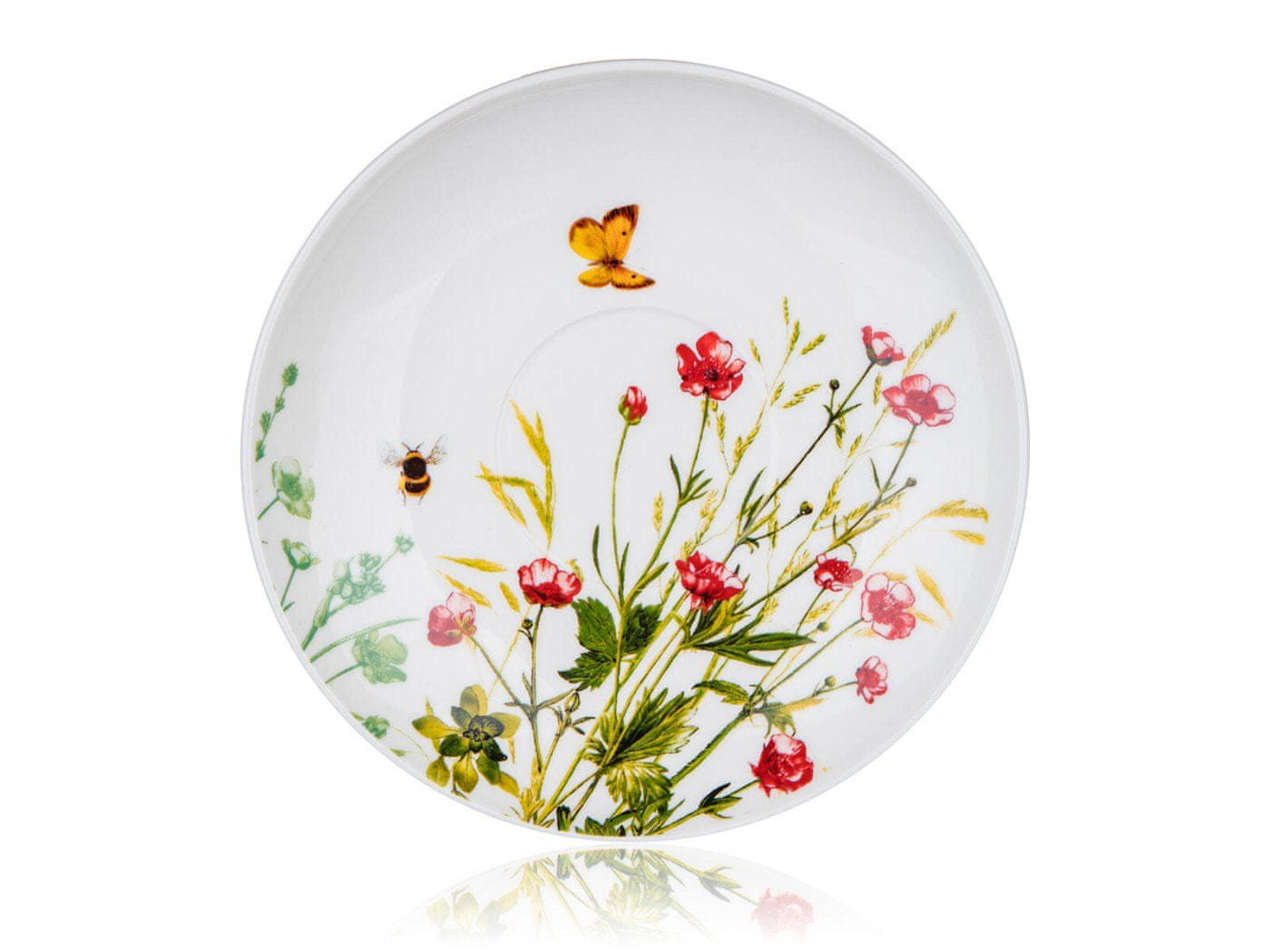 Šalka in krožnik MEADOW s čudovitim cvetličnim vzorcem sta primerna za serviranje kave ali čaja tako ob vsakodnevnih kot tudi prazničnih priložnostih. Skodelica in krožnik sta primerna za uporabo v mikrovalovni pečici in pomivalnem stroju. S tem okrasom lahko kupite tudi druge izdelke in tako ustvarite čudovit set za serviranje.