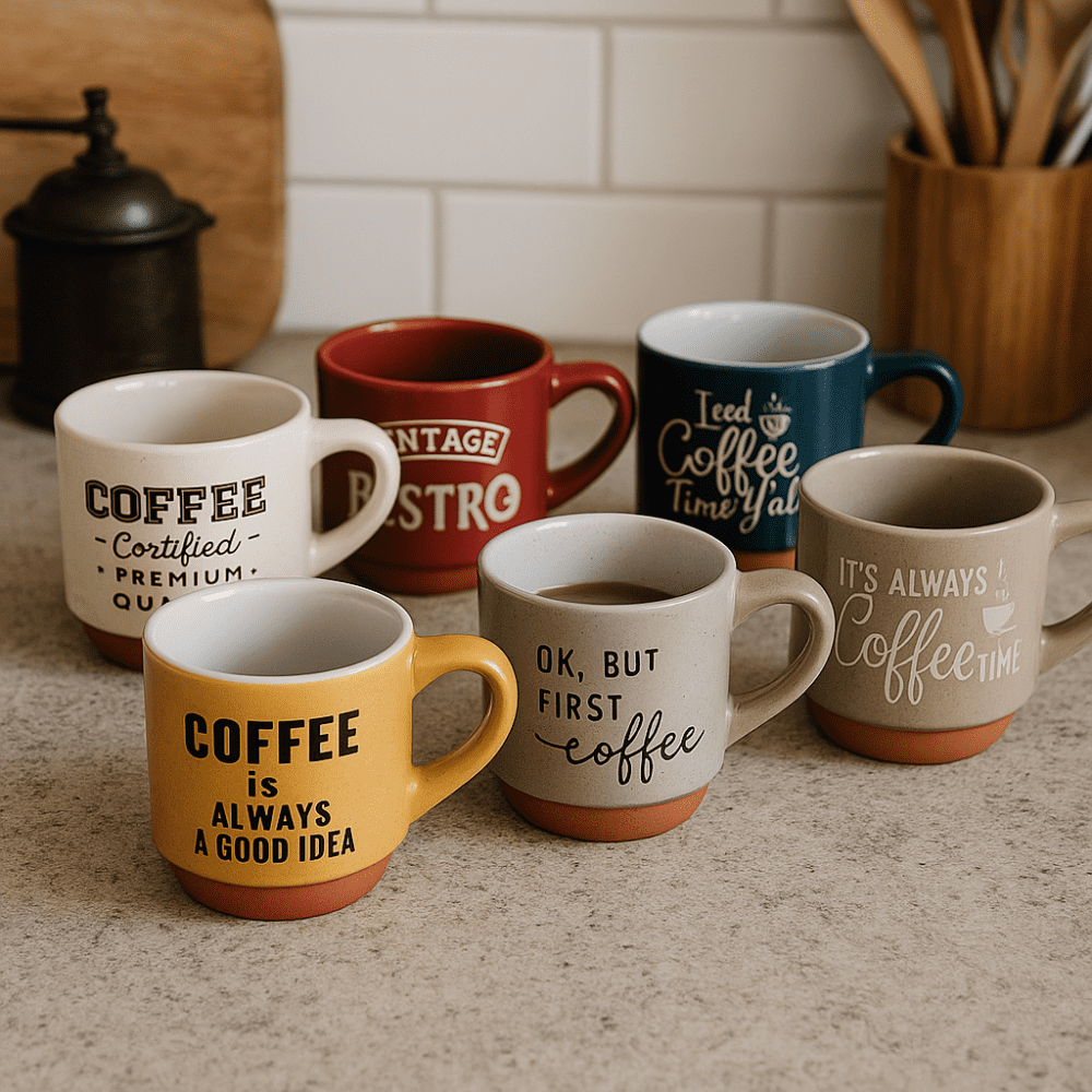 Set šestih lončenih vrčev z različnimi motivi za kavo.