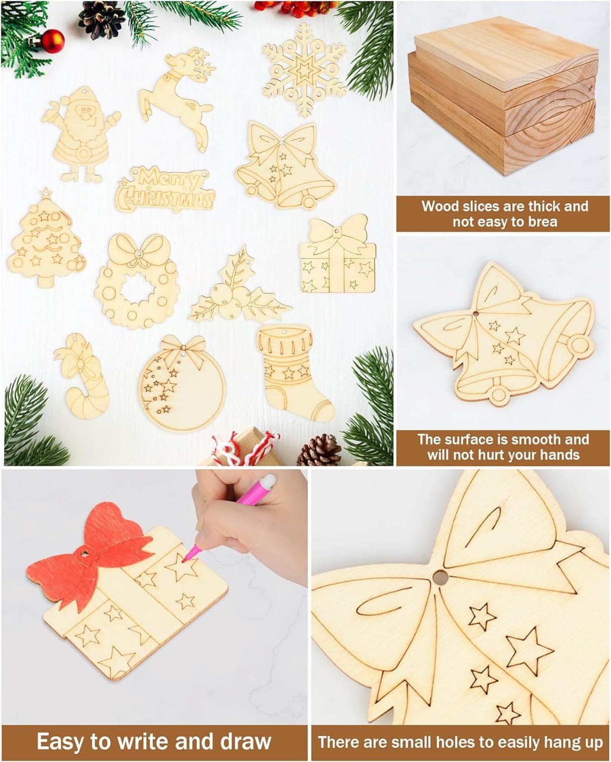 Komplet za ustvarjanje za božič je idealna rešitev za preživljanje časa z družino in prijatelji, saj omogoča ustvarjanje edinstvenih prazničnih dekoracij. Vsebuje 12 lesenih božičnih obeskov, 12 vrvi iz konoplje, 12 akvarelnih barvic in 2 božična lesena svetlobna obeska, kar zagotavlja vse potrebno za takojšen začetek. Vsak obesek je izdelan iz visokokakovostnega naravnega lesa z gladko površino, ki je pripravljena za pisanje in risanje. Obeski so opremljeni z majhnimi luknjami in vrvicami iz jute, kar omogoča enostavno obešanje kjerkoli – na božična drevesa, stene, vrata, okna, kamine ali stopnice.
