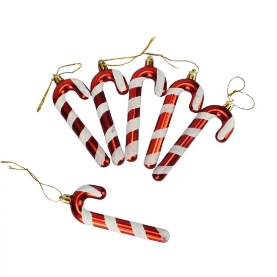 Rdeči okraski v obliki sladkornih palčk v praznično rdeči barvi z zlato vrvico. V zavoju je 6 kosov.