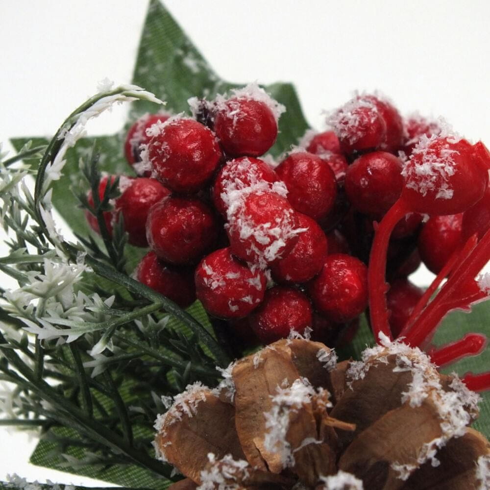 Zasnežena vejica s storžem in rdečimi bunkicami, 18cm Celoten opis