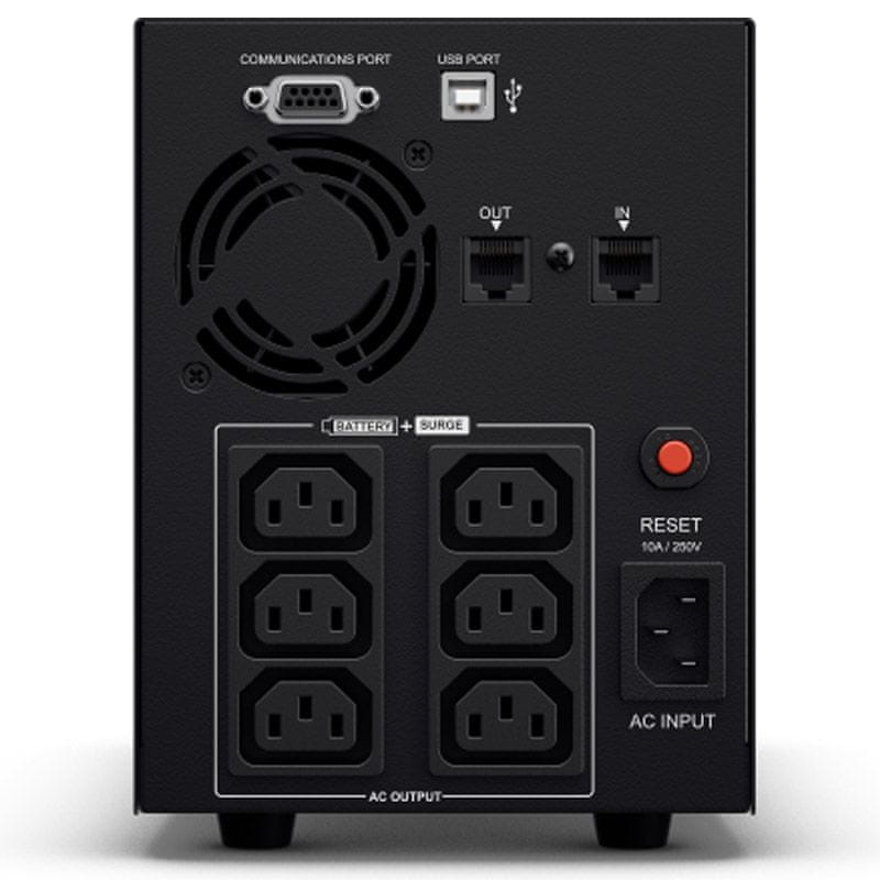 Indikatorska lučka prikazuje, delovaje baterije, stanje delovanja UPS in uporabnost UPS naprave. Ostale lastnosti vsebujejo zaščito pred preobremenitvijo, EMI filter in nastavljiv alarm za zaščito vaših naprav. Njegova zasnova stolpa omogoča uporabnikom, da ga enostavno postavijo na mize ali druge ozke prostore.