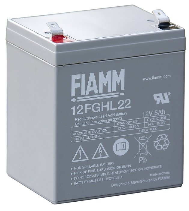 12FGHL22 FIAMM FGHL serija visoko zmogljivih 12V svinčeno-kislinskih hermetičnih akumulatorjev v VRLA tehnologiji z elektrolitom v AGM obliki z dolgo življenjsko dobo v ognjevarnem ohišju, brez vzdrževanja, predvidena življenjska dobo je 5 let. • 12V 5Ah • AGM|VRLA • DXŠXV: 90×70×101 | Faston 6.3 Celoten opis