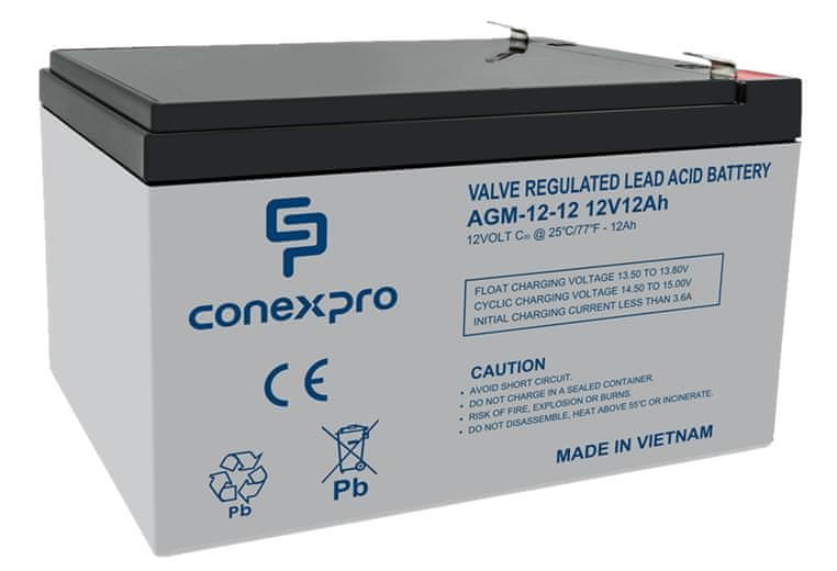 Hermetično zaprta svinčeno-kislinska baterija Conexpro AGM-12–12 s kapaciteto 12 Ah in napetostjo 12 V je primerna za neprekinjeno napajanje, požarne, varnostne, nadzor dostopa, telekomunikacijske in solarne sisteme ter za številne druge aplikacije. Gre zabaterijo VRLA AGM, ki ne potrebuje vzdrževanja, z elektrolitom, ki je prepojen z netkano tkanino iz steklenih vlaken. Ta model je tako odporen na udarce in razlitja, delo v nagnjenem ali drugem položaju pa mu ne bo povzročalo težav. Poleg tega ima baterija odlične lastnosti polnjenja, zagotavlja boljšo temperaturno stabilnost, prenese ciklične obremenitve (polnjenje in praznjenje) in ima življenjsko dobo do 10 let, zato je popolnoma zanesljiva.