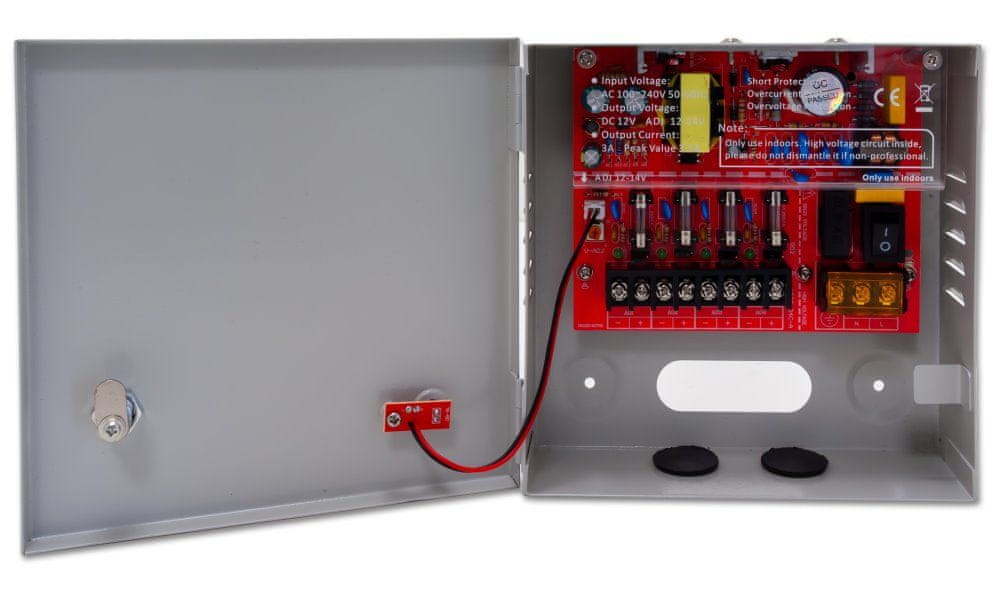 Stabiliziran napajalnik za štiri naprave, nastavljiva enosmerna napetost 12–14 V, vsak priključek največ 1 A. Skupni izhodni tok 3 A, kratkotrajni 3,5 A. Stenska omarica z nameščenim tiskanim vezjem z glavnim stikalom in kabelskimi vložki. Kabelski priključki na notranji priključni blok. Zaščita pred kratkim stikom z instrumentalno varovalko, prenapetostna zaščita. LED indikacija funkcionalnosti vrat. Vrata so opremljena z enostavno ključavnico.
