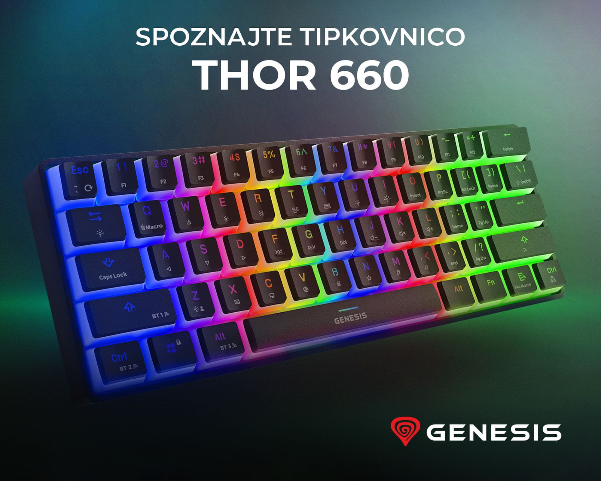 Genesis THOR 660 je brezžična / žična gaming tipkovnica, ki vas bo navdušila v vseh pogledih! Njen atraktiven videz ji daje unikatnost, prav tako pa tipkovnico odlikujejo njene izjemne funkcije in prednosti pred konkurenco. Prepustite se edinstveni barvni kombinaciji z RGB LED osvetlitvijo in se o njenih odličnih funkcijah prepričajte sami!