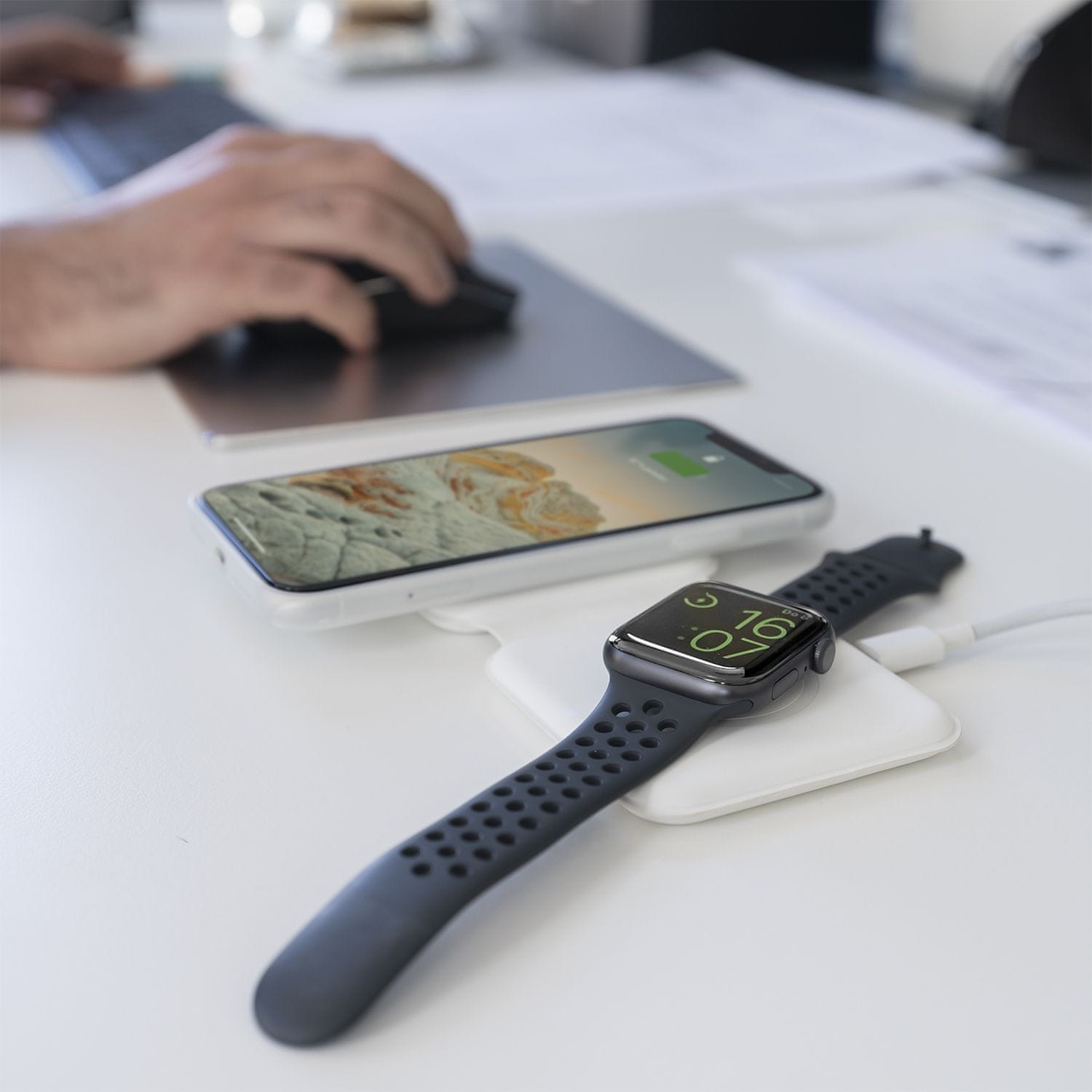 Enostavno: preprosto pridržite hrbtno stran naprave na polnilniku. Magnetna privlačnost med iPhone 12 ali Apple Watchom in polnilno ploščico zagotavlja, da slednji zavzame optimalni položaj polnjenja in prenese idealno količino toka.
