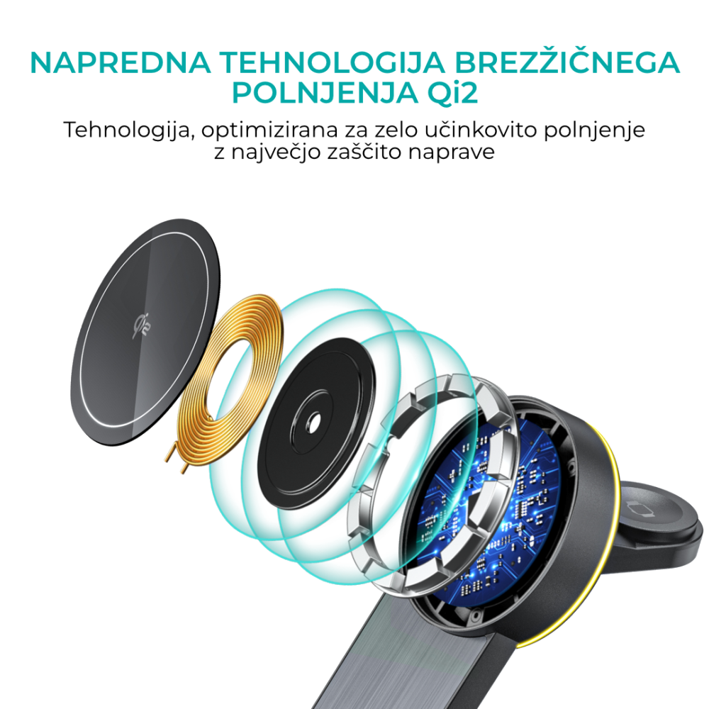 Ta polnilni stojalo je opremljeno z napredno tehnologijo MagSafe, ki vaš telefon s pomočjo močnih magnetov trdno in varno pritrdi na pravo mesto. Kombinacija s tehnologijo Qi2 zagotavlja maksimalno učinkovitost polnjenja.