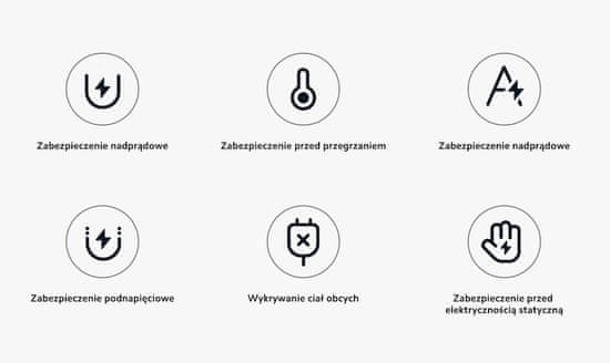 Vgrajeni varnostni sistemi ščitijo pred pregrevanjem, prenapetostjo in drugimi tveganji.