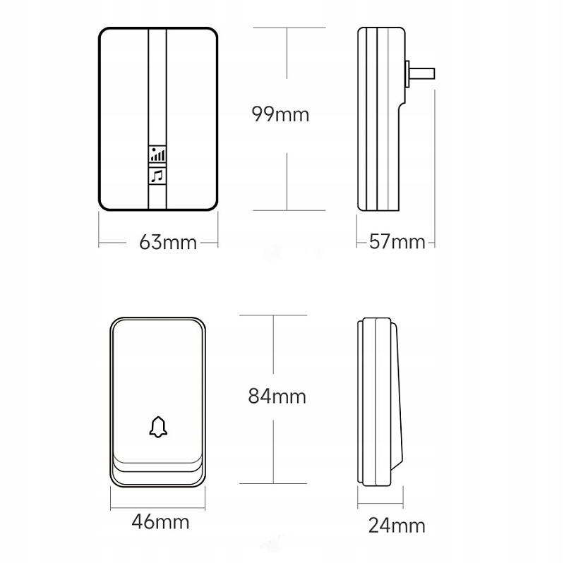 9,9 × 6,3 × 5,7 cmOddajnike je mogoče seznaniti z enim ali več sprejemniki, vsak oddajnik pa je mogoče nastaviti na drugačen zvonec.