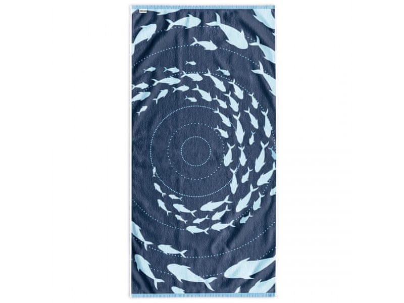Kopalna brisača SHOAL je obojestranska, saj je sprednja stran iz prijetnega velurja, zadnja pa iz frotirja. Njen očarljiv dizajn v modro-beli barvni kombinaciji z jato ribic bo vašemu plažnemu videzu dodal piko na i in eleganco.