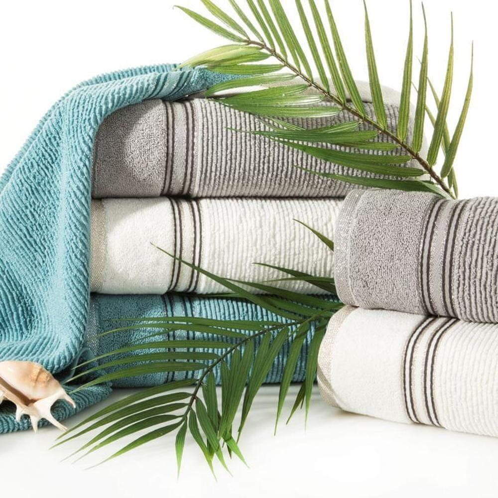 Zelo puhasta in izjemno vpojna brisača iz frotirnega bombaža s fino rebrasto strukturo. Širina: 50 cm, dolžina: 90 cm, barva: krem, teža: 530 GSM, sestava: 50 cm: 100 % bombaž; 87,1 % bombaž 9,6 % kovinska nit 3,3 % poliester