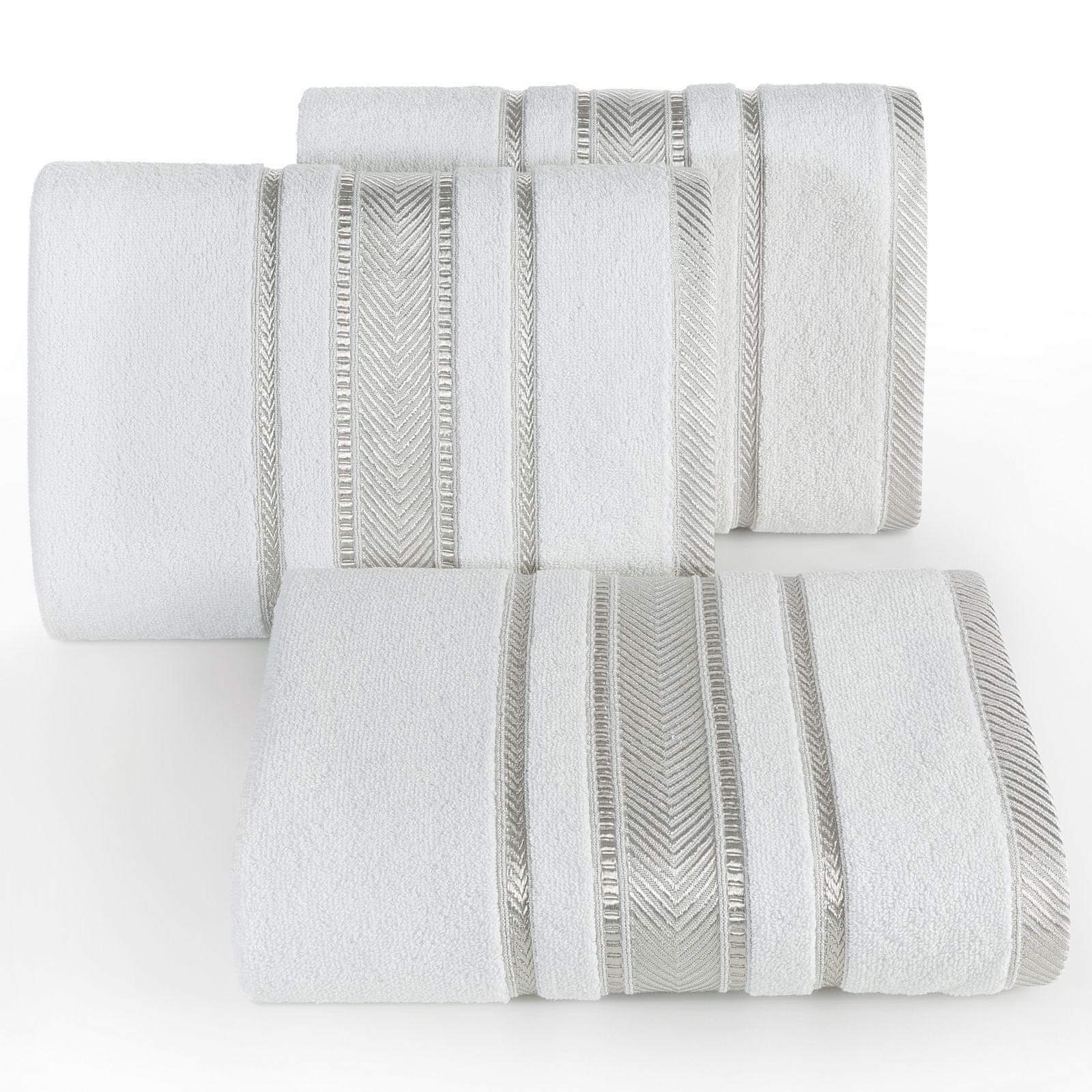 Elegantna, klasična kopalna brisača iz vpojnega bombažnega frotirja. Mehka brisača je okrašena z obrobo v geometrijskem vzorcu in je odporna na pogosto pranje. širina: 50 cm, dolžina: 90 cm, barva: bela, teža: 500 GSM, sestava: 100 % bombaž; 92 % bombaž, 8 % poliester