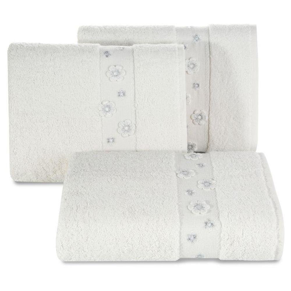 Vpojna in zelo mehka frotirna brisača iz bombažnih vlaken. Okrašena z obrobo s prišitimi cvetličnimi aplikacijami. Barve, ki jih je mogoče prati. širina: 70 cm, dolžina: 140 cm, barva: krem, teža: 450 GSM, sestava: 100 % bombaž; 96 % bombaž, 4 % poliester