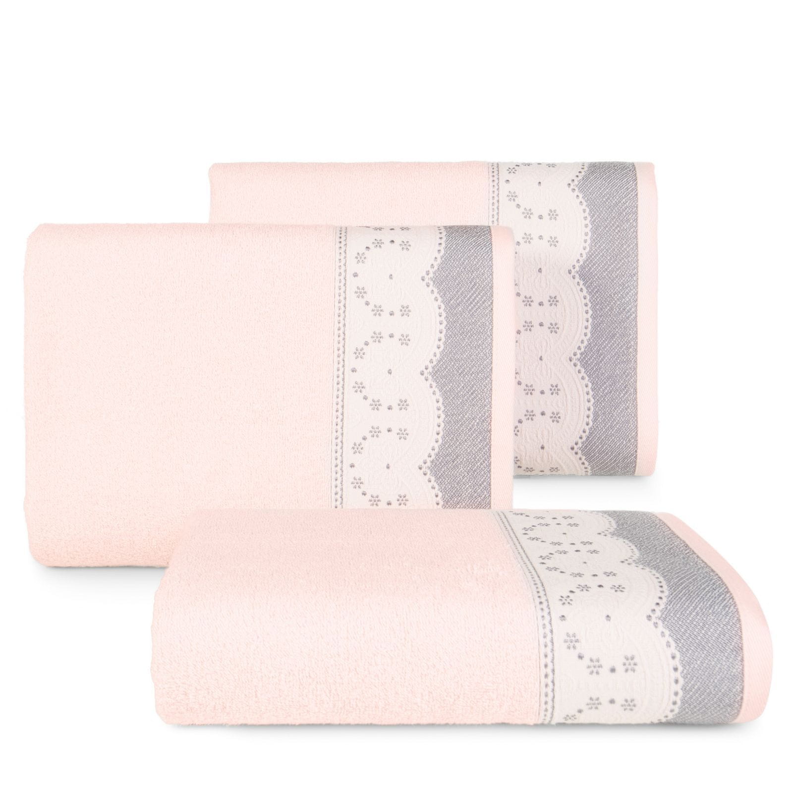 Elegantna bombažna kopalna brisača iz frotirja. Krajši robovi so okrašeni z aplikacijo, ki posnema čipko. Enostavno pranje, ne obarva. širina: 70 cm, dolžina: 140 cm, barva: roza, teža: 450 GSM, sestava: 100 % bombaž; 98 % bombaž, 2 % poliester