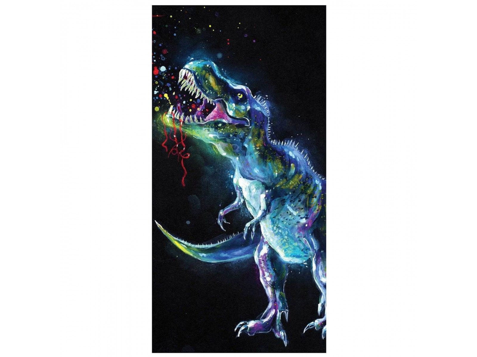 Črna brisača okrašena z dinamičnim potiskom dinozavra bo zagotovo pritegnila pozornost in všeč mladim ljubiteljem prazgodovinskih bitij.