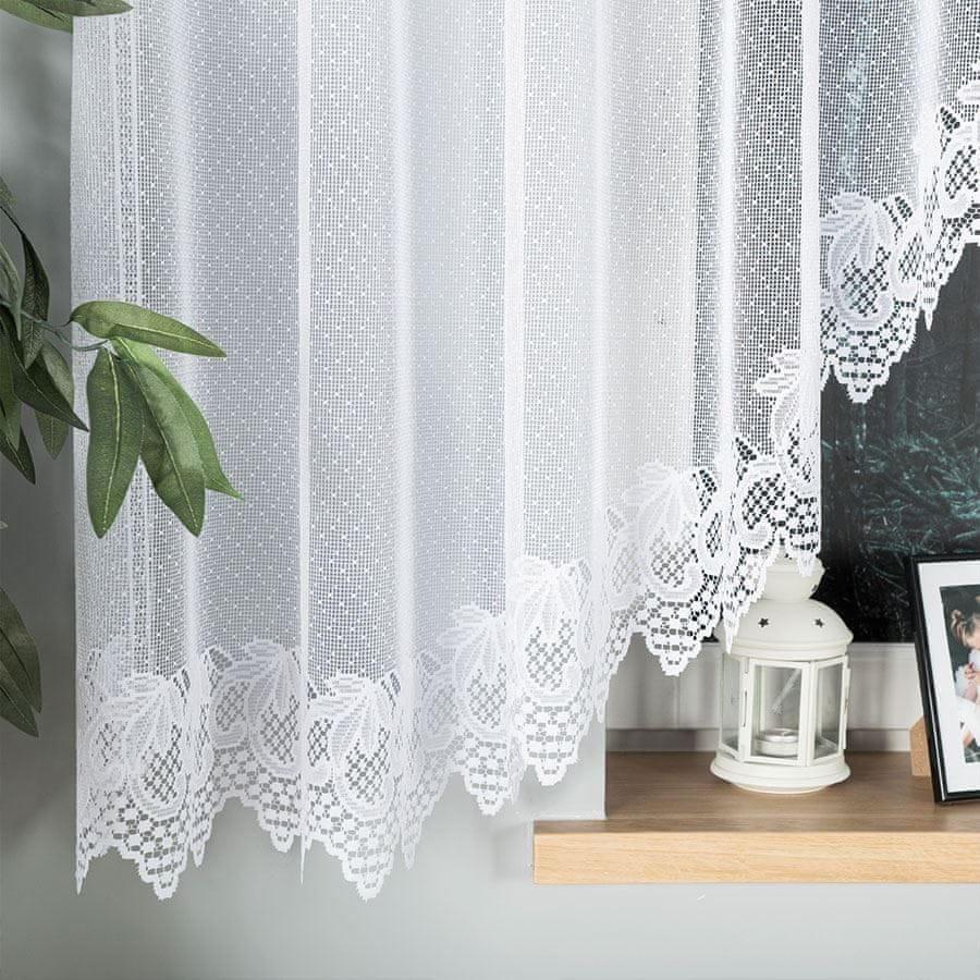 ELŻBIETA v impresivni velikosti 530×160 cm je že izdelana žakard zavesa, ki bo preobrazila videz širokih oken in zasteklitve. Belo blago je okrašeno z nežnim vzorcem listov, spodnji podrezani rob pa ji daje eleganten, klasičen videz. Zavesa, obešena z žabami, omogoča hitro montažo brez dodatnih predelav.
