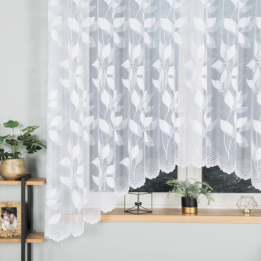 Martyna dimenzije 300×180 cm je že izdelana žakard zavesa z velikim, dekorativnim vzorcem listov in dekorativnim podrezom v nežnem loku. Ta model se po nabiranju popolnoma prilega oknu širine približno 150 cm. Obesi se s sponkami – brez nabirajočega traku.