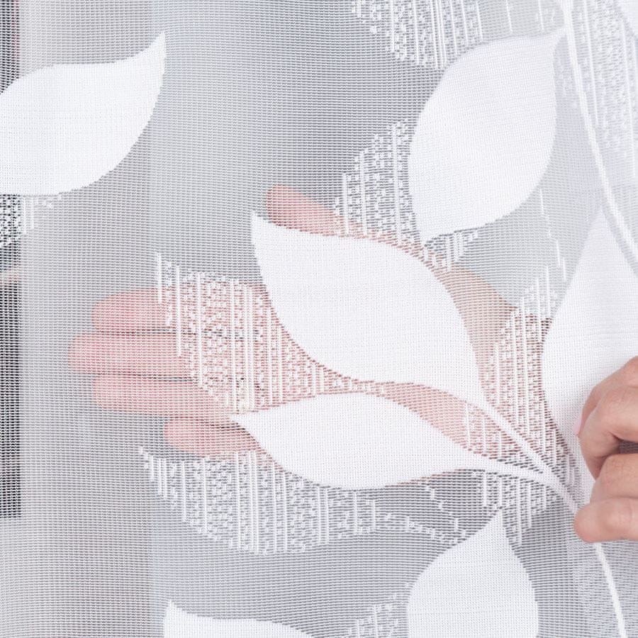 Bel žakard z nežno strukturo lepo prepušča svetlobo, veliki listi pa dodajo značaj notranjosti. Zavesa ustvarja prijetno, a moderno vzdušje in se odlično ujema z rastlinami in naravnimi dodatki.
