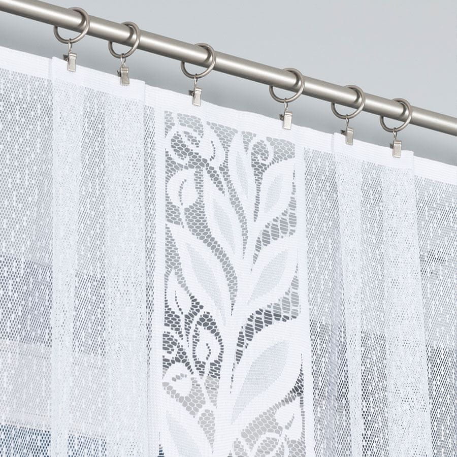 Njena največja dekoracija je visok, navpičen vzorec listov v kombinaciji z nežnimi cvetličnimi poudarki in globokim podrezom, ki ustvarja elegantno linijo na dnu. Bela žakard tkanina z ažurnim tkanjem lepo prepušča svetlobo, ne da bi pri tem ogrozila zasebnost.