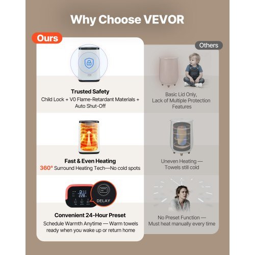 Ta vedrukuivati ämber on loodud teie vannitoa rutiini mugavaks ja lihtsaks muutmiseks. Tänu täiustatud turvafunktsioonidele nagu lapsekindel lukk ja kõrge temperatuuri indikaator tagab see perele meelerahu. Selle ruumikas maht ja ühtlane soojendussüsteem muudavad selle ideaalseks rätikute tekkide riiete ja hommikumantlite soojendamiseks luues kodus hubase spaataolise kogemuse.