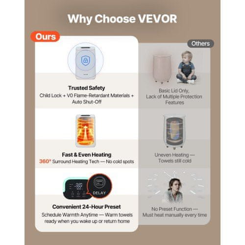Ta brisačnik vedro je zasnovano za udoben in priročen način segrevanja brisač odej oblačil in kopalnih plaščev za celotno družino. Opremljeno z otroškim zaklepom in indikatorjem visoke temperature zagotavlja varnost ter enakomerno 360° segrevanje za stalno toploto. Z veliko prostornino in enostavnimi nastavitvami časovnika je ta brisačnik idealen za ustvarjanje sproščujoče domače spa izkušnje brez potrebe po namestitvi.