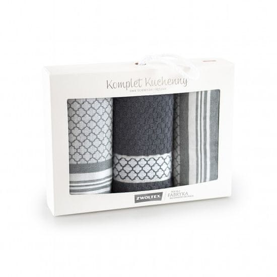 Tridelni komplet v elegantni škatli vsebuje dve hitro sušeči krpi in žametno mehko bombažno brisačo iz kolekcije Morocco. Serija, ki jo je navdihnila toplina maroških počitnic, je dih eksotike, kot nalašč za ljubitelje potovanj in izvirnih oblikovalskih rešitev. Grafitna barva je super moden barvni predlog in eleganten okras moderne kuhinje. Maroko bo čiščenje hiše naredil prijetnejše in veliko bolj priročno.