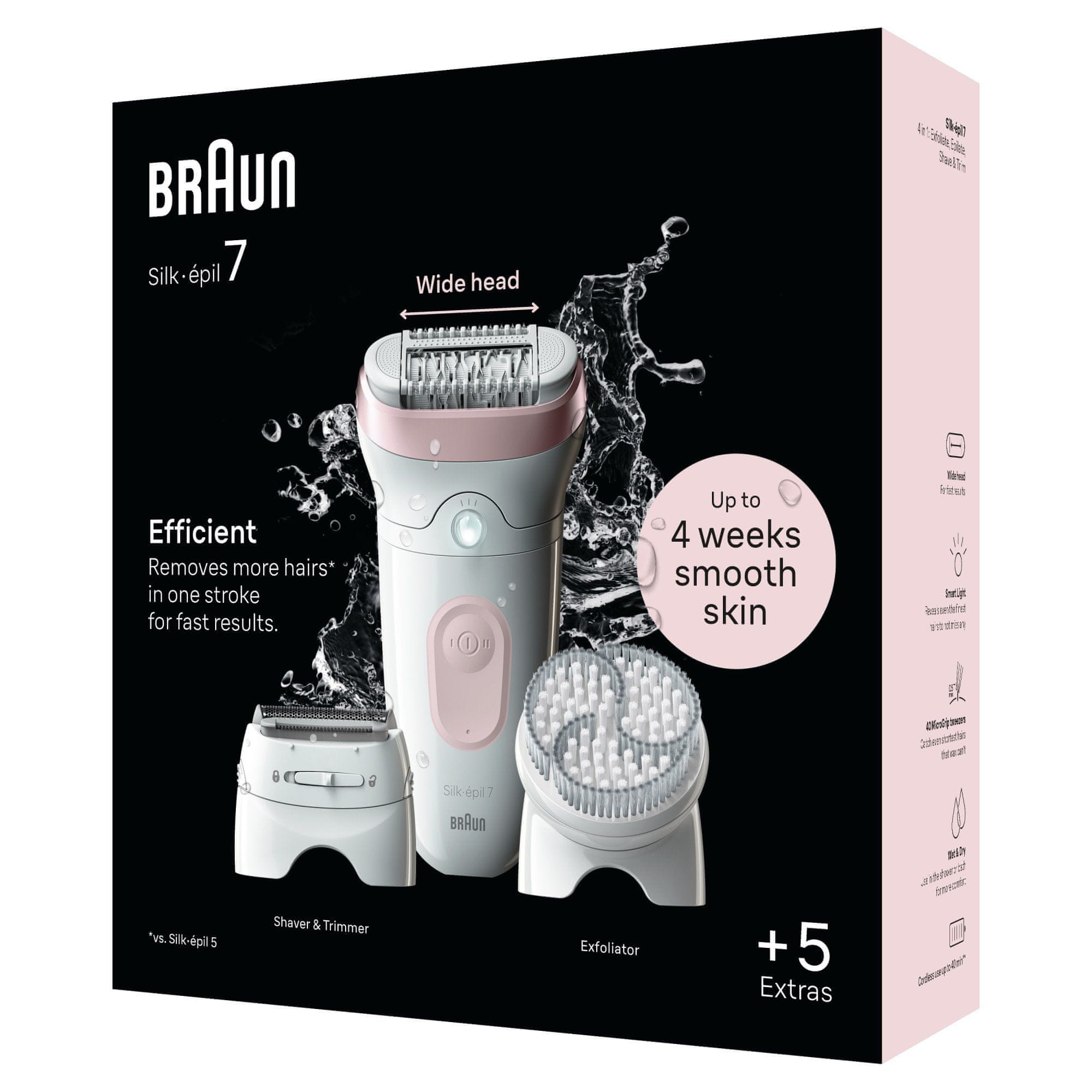 Epilator Braun Silk-épil 7 zagotavlja do en mesec gladke kože, učinkovito in kadar koli. Primeren je za mokro in suho uporabo ter je opremljen s široko glavo, ki pokriva velika območja, da ujame več dlačic (kot Braun Silk-épil 5) z vsako potezo. Ta epilator Braun brez priključne vrvice se odlikuje s tehnologijo pincet MicroGrip, ki lahko ujamejo dlačice, ki niso daljše od 0,5 mm. Uživajte v gladki koži kot po obisku salona, vendar z dodatnim udobjem po zaslugi nastavka z masažnimi valjčki, ki lahko pomaga zmanjšati občutek bolečine. Poslovite se od neprijetnega čakanja na to, da dlačice ponovno zrastejo, ki je potrebno za druge metode odstranjevanja dlačic, kot je vosek. Epilator je zasnovan za priročnost in poskrbi, da čiščenje nereda ali obiski salona niso potrebni. Nasvet: Občutek bolečine bo manjši, če boste epilator uporabljali v kadi ali pod prho s toplo vodo. Zasnovan, da traja vrsto let: epilatorji so izdelani v Nemčiji.