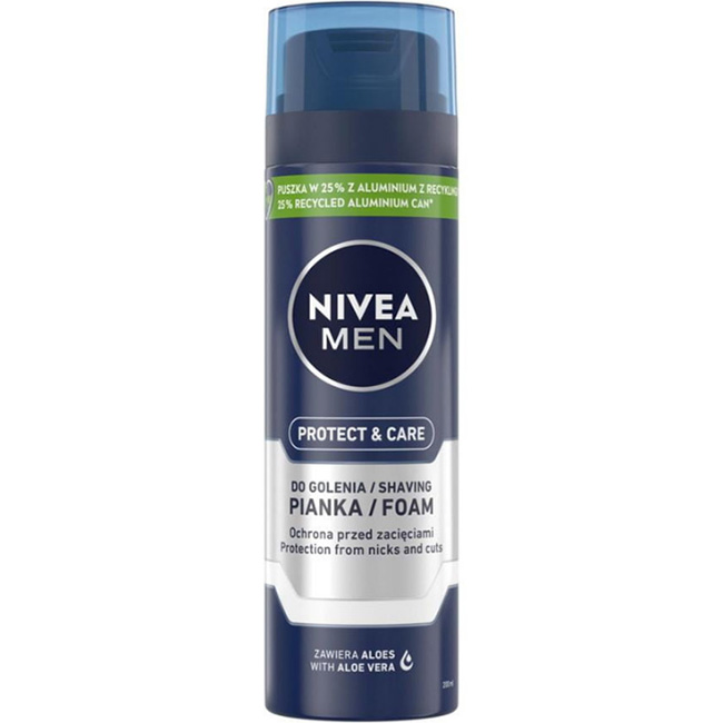 NIVEA MEN Protect & Care vlažilna pena za britje je napreden izdelek, ki združuje učinkovito nego z zaščito med britjem. Zahvaljujoč posebni formuli, obogateni z aloe vero in provitaminom B5, pena deluje na več načinov: ščiti kožo pred draženjem, intenzivno vlaži in krepi njeno naravno zaščitno pregrado. Pena zagotavlja temeljito in udobno britje, ki kožo pusti gladko in negovano.