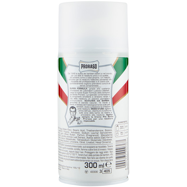• Nežna in učinkovita : Pena Proraso White, priporočljiva za občutljivo kožo, vlaži in obnavlja povrhnjico ter jo ščiti pred draženjem in poškodbami.