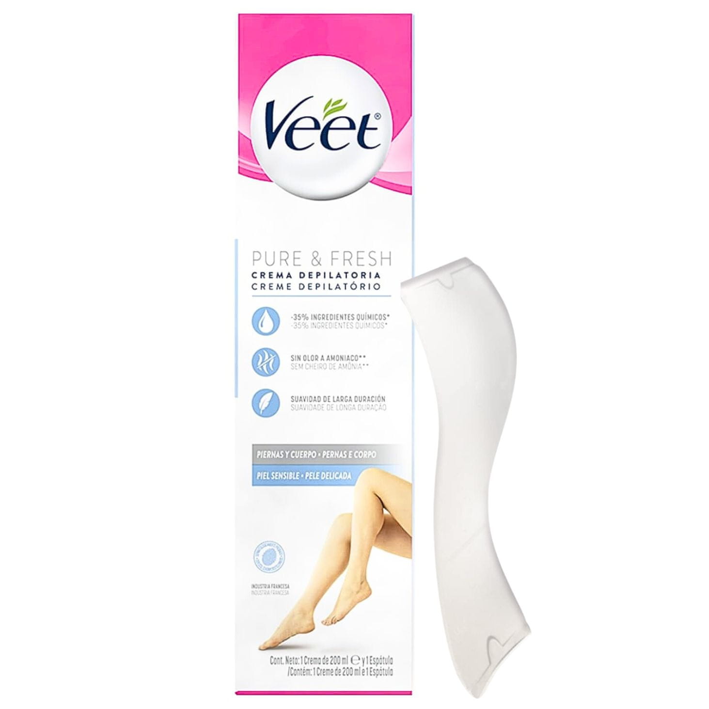 Nežna depilacijska krema za noge in telo Veet Pure 200 ml Krema za depilacijo Veet Pure je idealna za takojšnje odstranjevanje dlak na nogah in okolici. Njegova najčistejša formula in minimalne sestavine dajejo kožo mehko in gladko po vsaki uporabi. Zasnovan za odstranjevanje trdih dlak, deluje v 2 minutah in vlaži do 48 ur. Dermatološko testiran je primeren za vse tipe kože, tudi za občutljivo kožo. Najboljši način, da se poslovite od britvic in dosežete optimalne rezultate brez poškodb. Nova krema za odstranjevanje dlak Veet Minima ima izboljšano formulo s 35 % manj kemikalij kot prejšnja formula, ki zagotavlja mehkobo in vlaženje do 24 ur. Lastnosti izdelka: Pomirjujoč vonj aloje in vijolice. Klinično dokazano zdrži do 7 dni gladke kože. Piling in vlažilni učinek. Kako uporabiti: Nanesite na kožo in razporedite po predelih, ki jih želite odstraniti. Po 3 do 6 minutah odstranite z lopatico. Sperite z vodo.