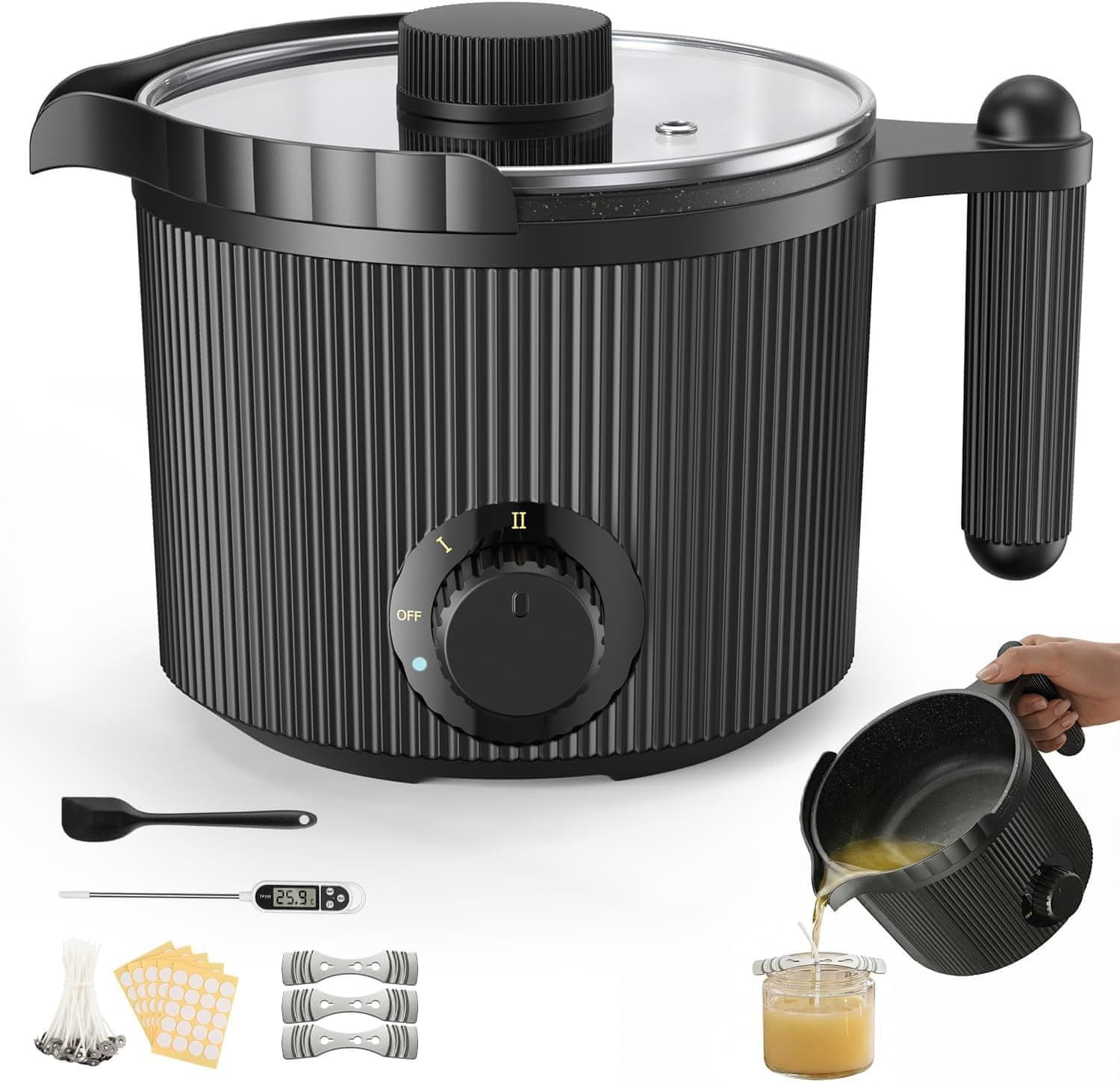 ? **FONCOOD Profi komplet za izdelavo sveč s 3D tehnologijo ogrevanja: Dvojna stena iz nerjavečega jekla enakomerno porazdeli toploto za popolno taljenje voska za sveče – 40 % hitrejše od standardnih modelov! Vgrajen LED prikaz temperature zagotavlja natančno delo z voskom za sveče. | ?️ Varnost po nemškem industrijskem standardu: ročaj za zaščito pred vročino + izolirano ohišje posode za taljenje voska + keramično varnostno dno. Preprečuje opekline pri taljenju voska za sveče – idealno za družine z otroki! | ?️ Inteligentni regulator temperature: Posoda za taljenje voska za sveče se samodejno ustavi pri 128 °C (v skladu z DIN EN 60335) in ponovno zažene pri 80 °C. Varnost tudi pri večurnem ustvarjanju dišečih sveč. | ? Revolucija čiščenja z nano-teflonom: Premaz proti prijemanju, primeren za živila, odstrani ostanke voska za sveče z vlažno krpo v 5 sekundah! Prihrani 15 minut časa za čiščenje na uporabo – več časa za ustvarjalne silikonske oblike sveč. | ? Univerzalna posoda za kuhanje na pari za vaš DIY-vesolje: Uporabite talilnik voska za sveče tudi kot posodo za vodno kopel za izdelavo mila, balzama za ustnice ali aromaterapijo. Združljiv z vsemi kozarci za sveče in stenji za sveče!