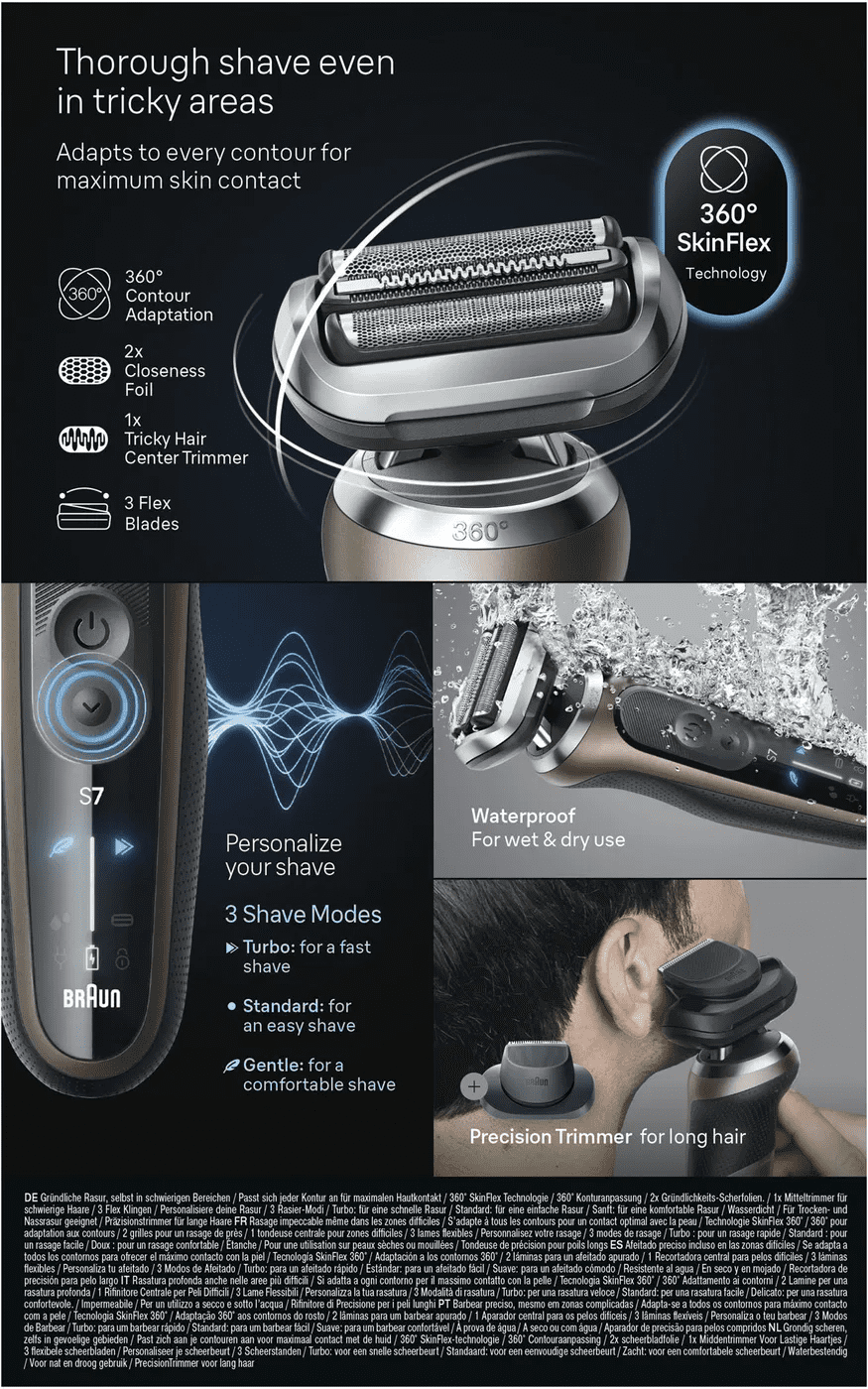 Braun Series 7 popolnoma sledi linijam vašega obraza in obrije tudi težje dostopna mesta. S tehnologijo SensoAdapt učinkovito obvladuje vse vrste gostih brad. Fleksibilna sklepna povezava med telesom brivnika in glavo omogoča vrtenje glave za 360°. Na voljo so trije načini britja – turbo za hitro britje, nežen za udobno britje in standardni za hitro in nežno britje.