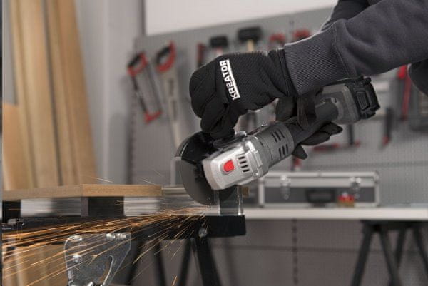 Ergonomsko oblikovan ročaj z mehkim oprijemom in dodatni stranski ročaj, ki ga lahko nastavite v dva položaja, vam pomagata pri rezanju in mletju, zato je mlinček primeren tako za desničarje kot za levičarje. Krog premera 115 mm je zaščiten z varnostnim kovinskim varovalom, velikost gredi pa je M14. Brusilnik uporablja blokado vretena in ima zelo kompaktno velikost, majhno težo in dobro uravnoteženo zasnovo za enostavno uporabo ne glede na delovne razmere.