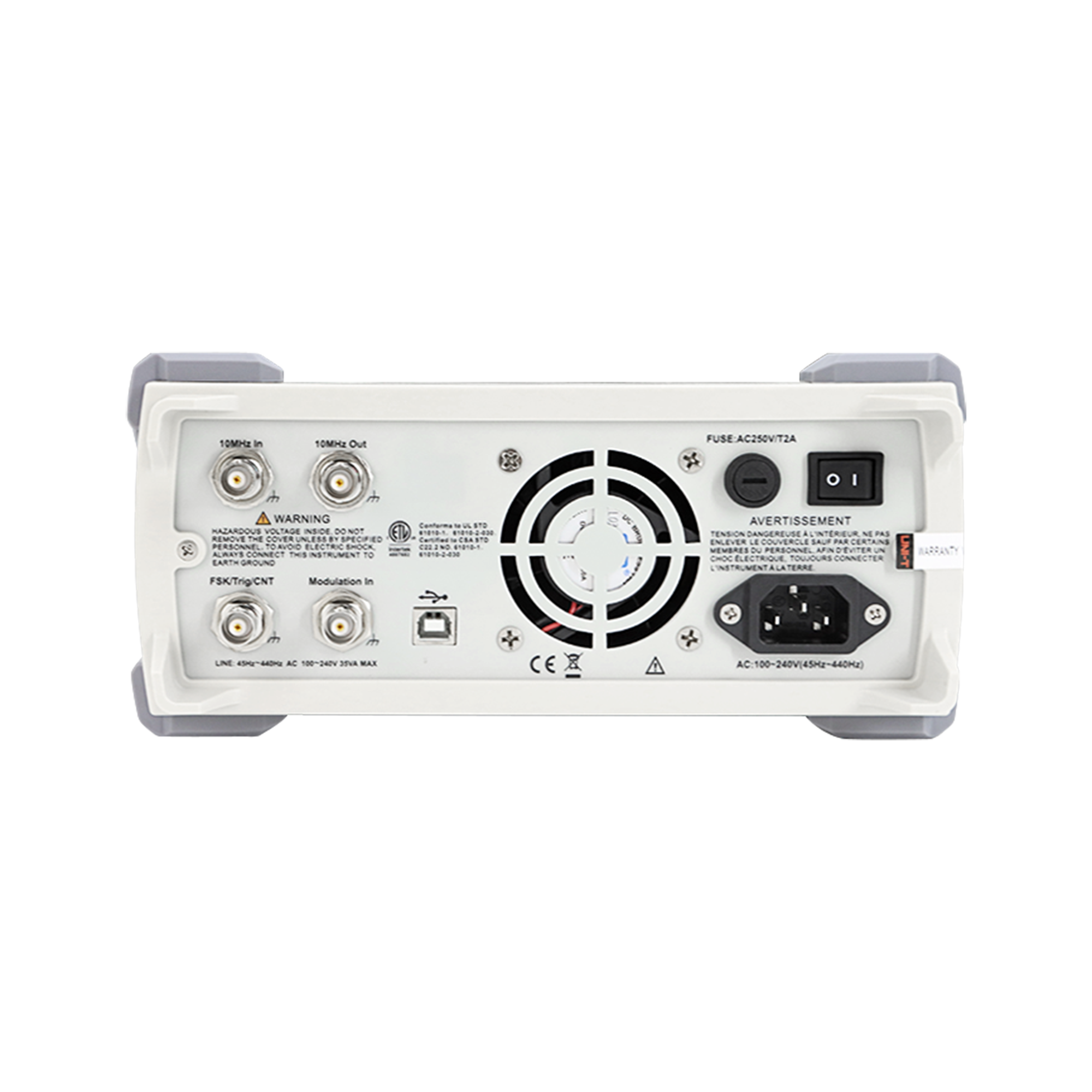 UTG2025A ponuja pasovno širino analognega izhoda do 25 MHz in ustvarja valovne oblike s frekvencami od 1 µHz do 25 MHz (za sinusne valove) in do 5 MHz (za kvadratne in pulzne valove). S hitrostjo vzorčenja 125 MS/s in 14-bitno ločljivostjo naprava zagotavlja visoko točnost in natančnost pri generiranju signala. Frekvenčna ločljivost 1 µHz in natančnost ±0,5 ppm (pri 25 °C) omogočata natančen nadzor nad izhodnimi parametri.