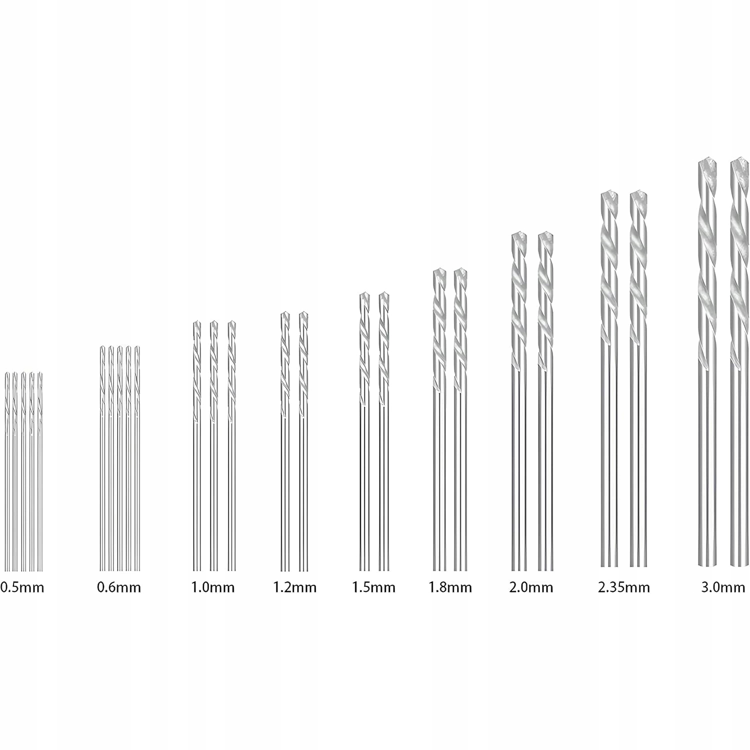 Komplet svedrov HSS:25 svedrov različnih velikosti (0,5 mm – 3,0 mm) omogoča prilagajanje orodja različnim materialom in potrebam: