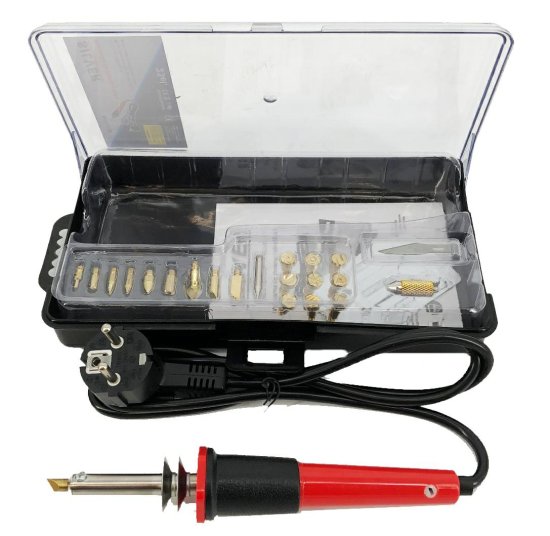SREBRNI gorilnik zasnovan za okraševanje usnjenih predmetov z uporabo ogrevane konice ki izžiga okraske ali risbe Z gorilnikom lahko sami okrasite in ustvarite številne predmete Priloženih je triindvajset elementov Napajanje 230 V 50 Hz Moč 30 W Temperatura 275 C