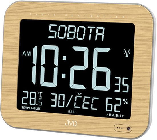 Digitalna ura blagovne znamke JVD navduši že na prvi pogled s svojim okusnim dizajnom. Pravokotni zaslon prikazuje aktualni čas, datum in dan v tednu – privzeto v češčini (lahko nastavite tudi drug jezik). Čas je vedno popolnoma točen, saj je ura radijsko vodena. Velika prednost sta vgrajen termometer in higrometer.