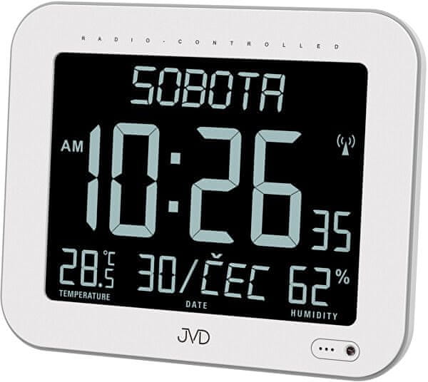 Digitalna ura blagovne znamke JVD navduši že na prvi pogled s svojim okusnim dizajnom. Pravokotni zaslon prikazuje aktualni čas, datum in dan v tednu – privzeto v češčini (lahko nastavite tudi drug jezik). Čas je vedno popolnoma točen, saj je ura radijsko vodena. Velika prednost sta vgrajen termometer in higrometer.