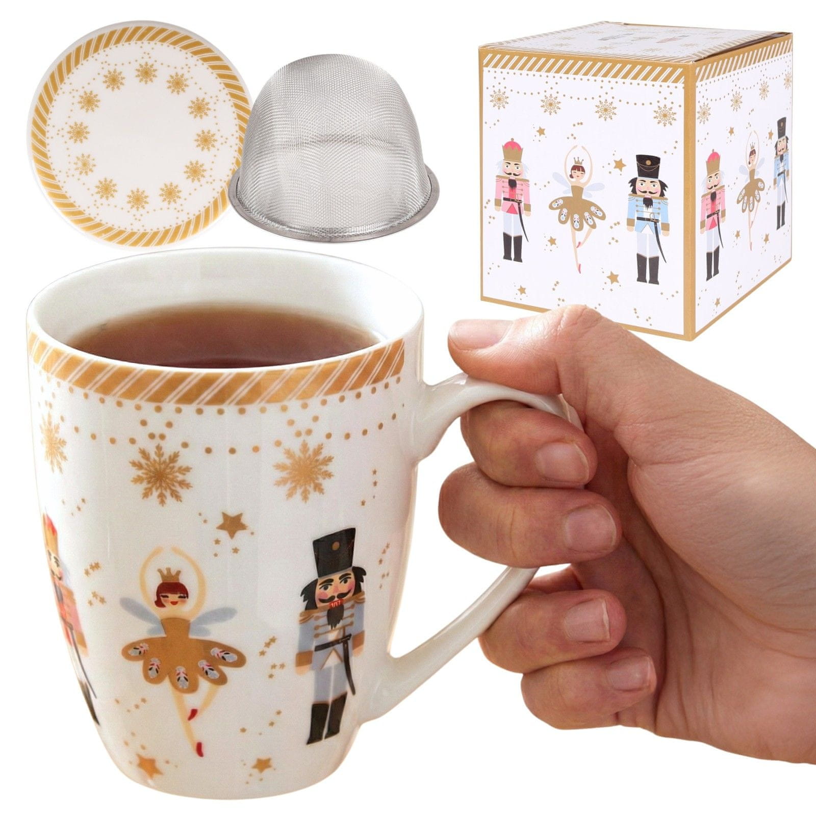 - Celoten darilni set – vrč, pokrovček, čajni filter in okrasna škatla so pripravljeno, elegantno darilo. – Visokokakovostni porcelan New Bone China – trpežen, gladek in snežno bel, za razkošen videz in udobno uporabo. – Božični motiv, ki ga je navdihnil „Luskalnik“ – zlati element