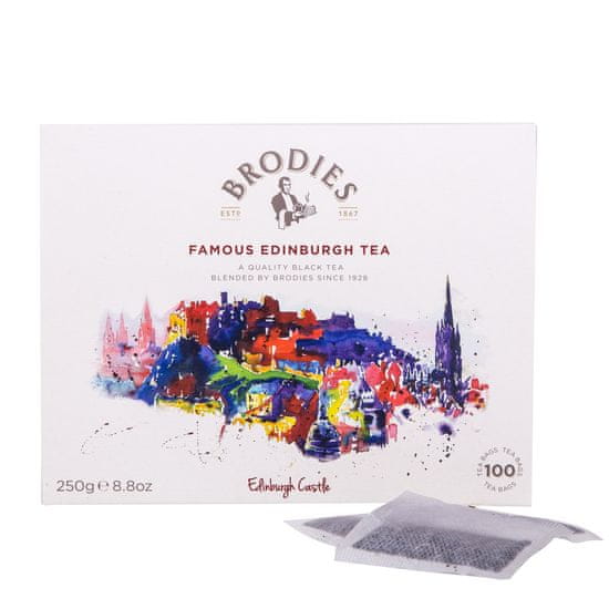 Brodies Famous Edinburgh Tea črni čaj, 100× 2,5 g vsebuje 100 porcij črnega čaja s tradicijo že od leta 1929. Lahka in nežna mešanica čaja iz Indije, Šri Lanke in Kenije nudi okusen užitek in je primeren za pitje kadarkoli v dnevu. Strogo varovan recept za ta čaj se že skoraj 100 let ne spreminja. Celoten opis